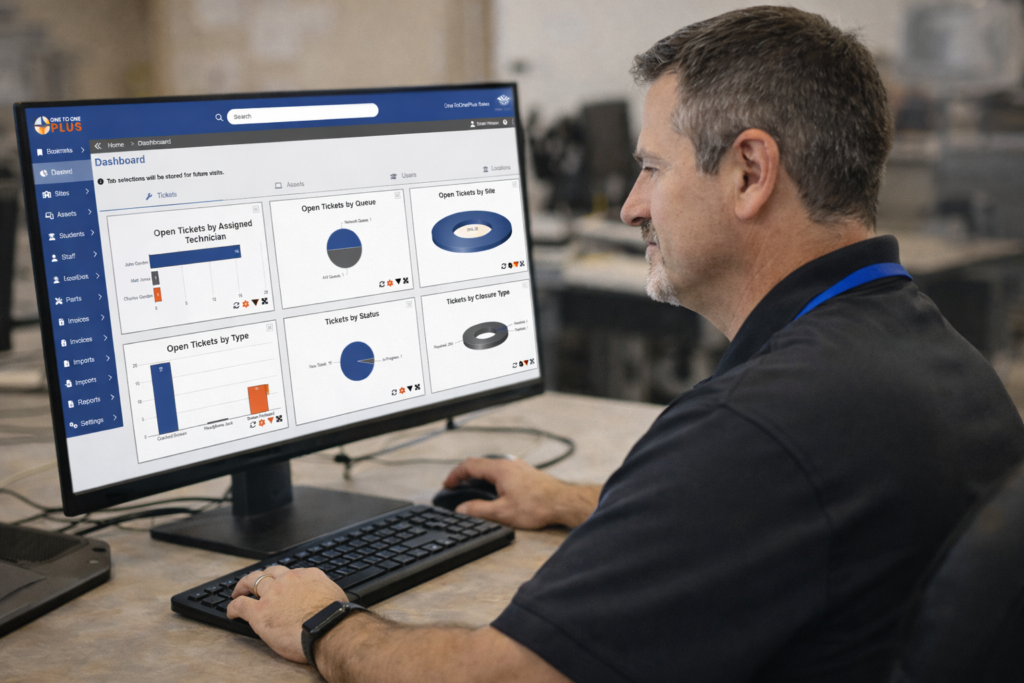One to One Plus brings together core K–12 technology management including assets, help desk, users, locations, mobile access, and integrations, along with advanced tools like dashboards, invoicing, parts management, and e-signatures.