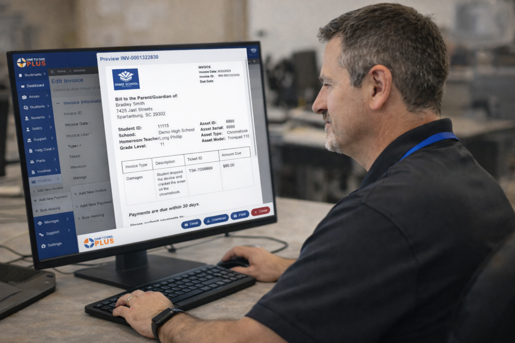 One to One Plus brings together core K–12 technology management including assets, help desk, users, locations, mobile access, and integrations, along with advanced tools like dashboards, invoicing, parts management, and e-signatures.